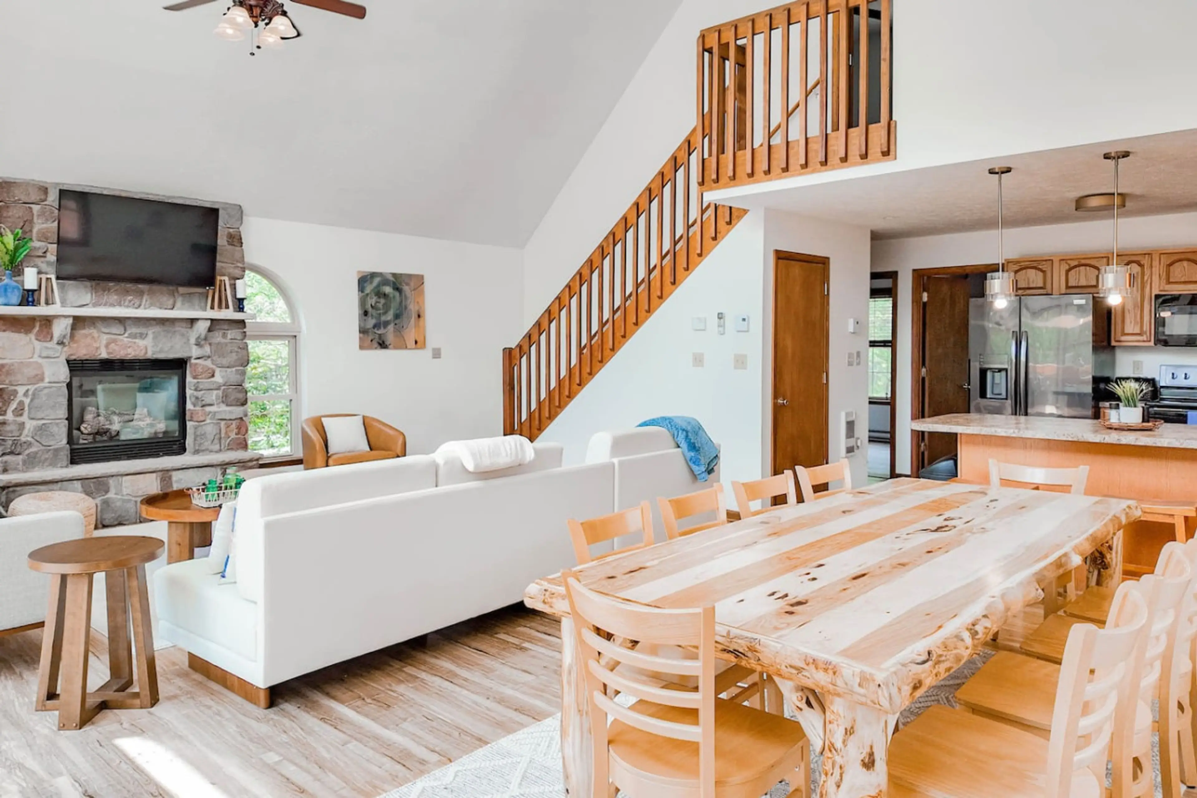 Your private lake-view lodge in the Poconos—perfect for family and group getaways. ~Sleeps 14 across 5 bedrooms ~Hot tub + lake view ~Game room: pool, foosball, shuffleboard, bar ~Fast Wi-Fi + smart TVs ~2–3 min walk to beach, lake, and pool (seasonal community amenities, pool not on property) ~Towa...
